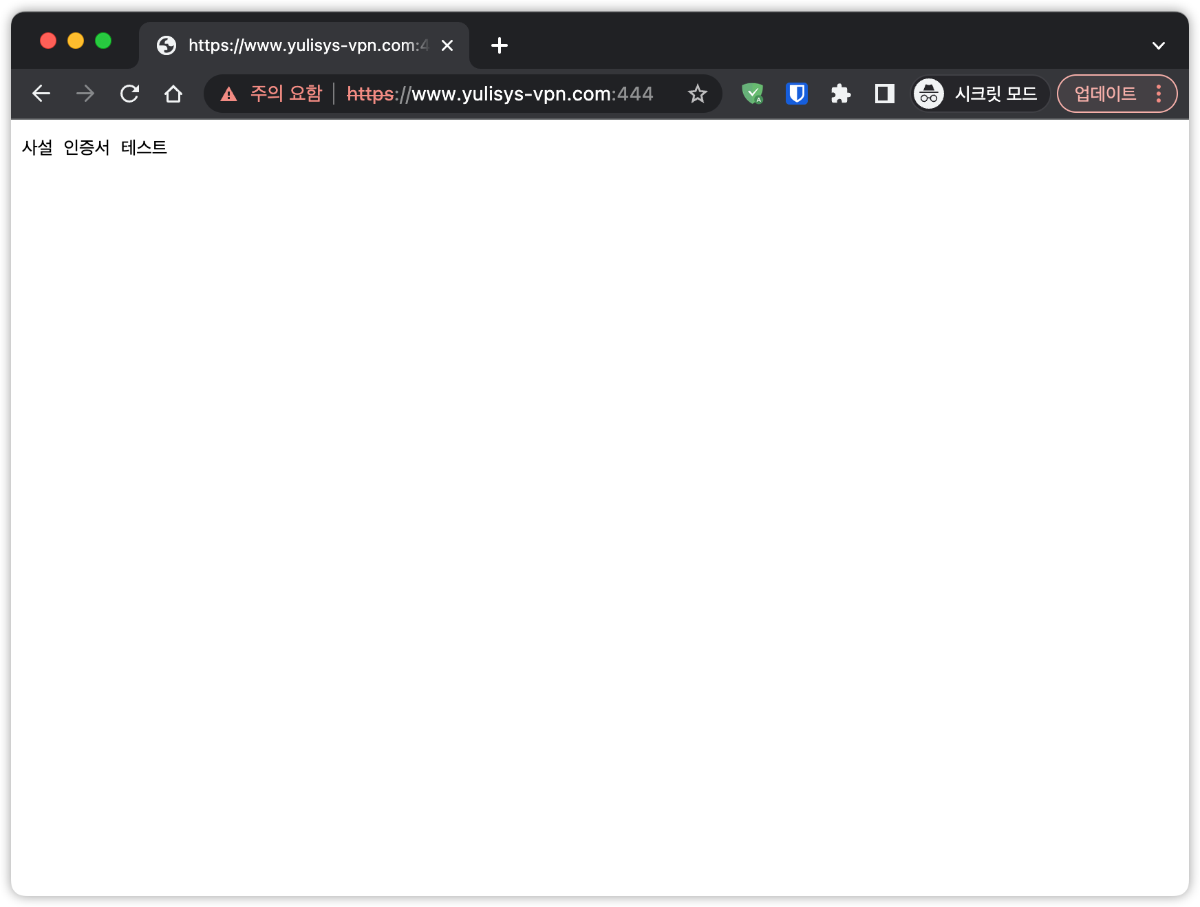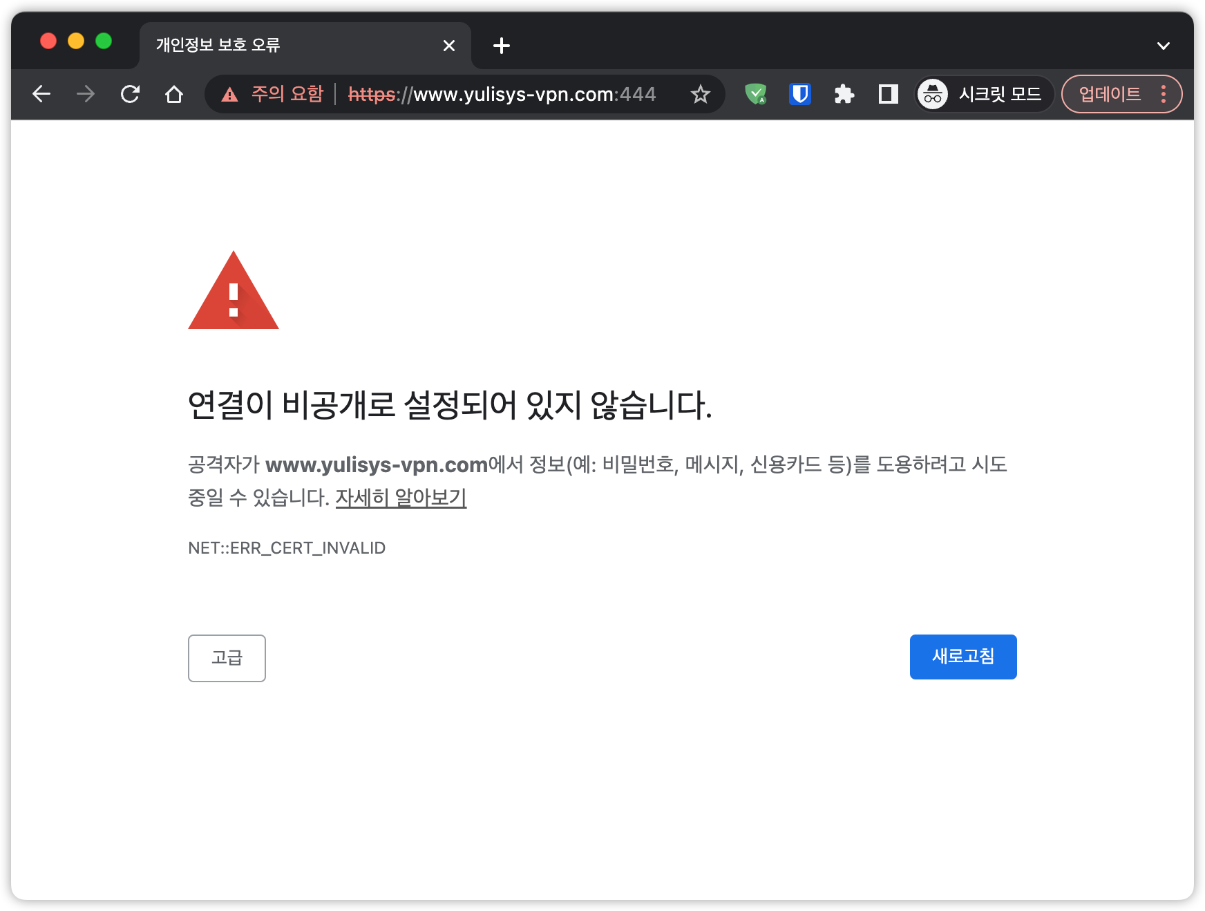 설정은 완료되더라도 인증서에 설정한 도메인인 “*.yulisys-vpn.com" 은 존재하지 않기 때문에 브라우저로 호출은 당연히 안됩니다. hosts 파일에 ELB의 아이피를 해당 도메인에 매핑하여 접근을 해도 아래와 같이 사용할 수는 없습니다.