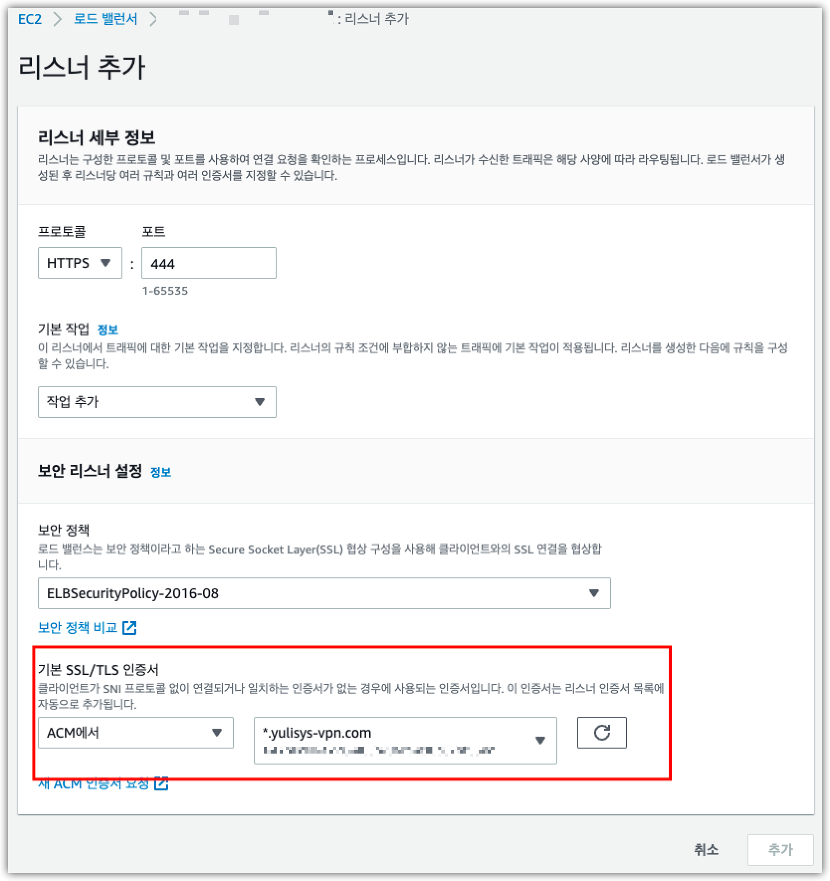 아래는 ELB의 리스너 추가시 이전에 등록한 사설 인증서를 선택하는 화면입니다.