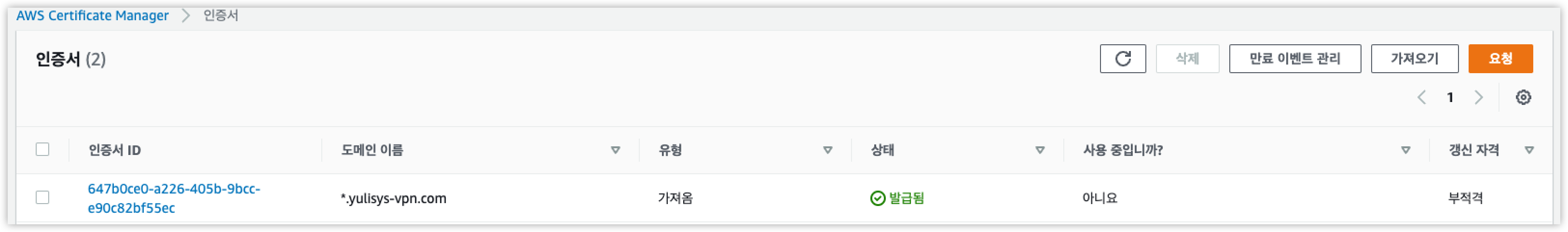 5. AWS 웹 콘솔의 ACM 에서 등록한 사설 인증서 확인해 봅니다.